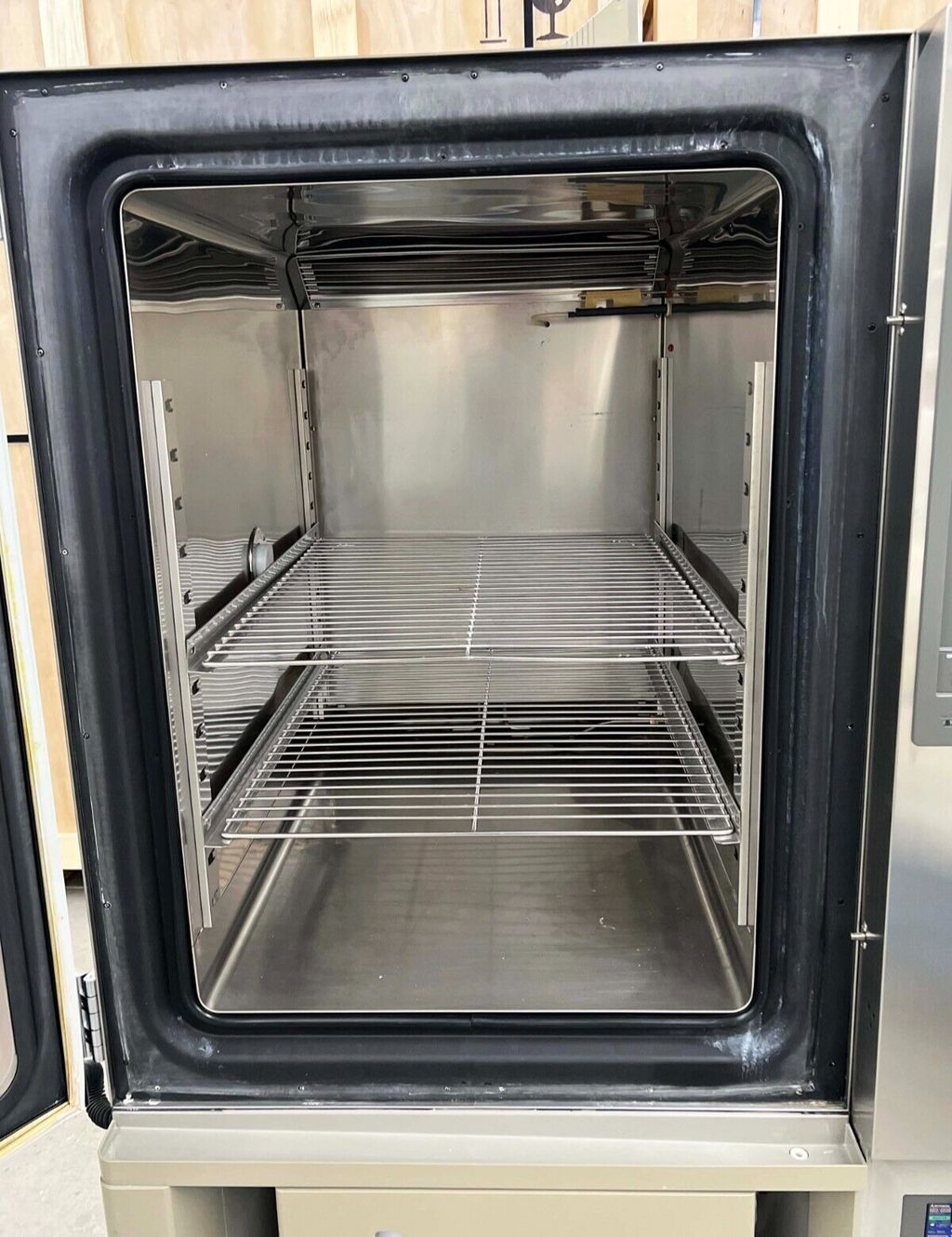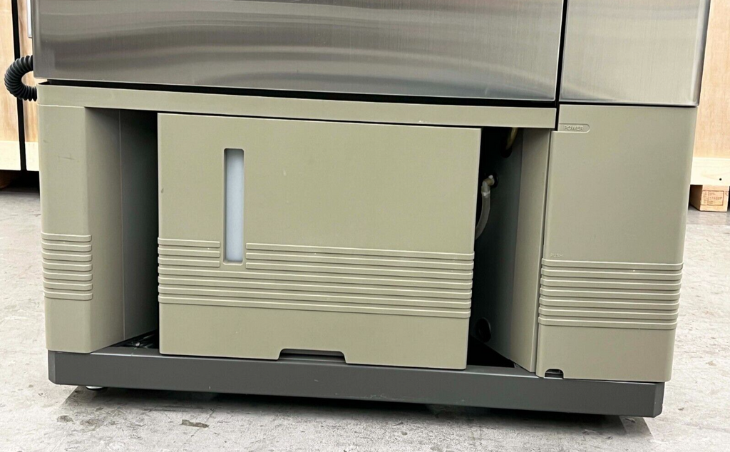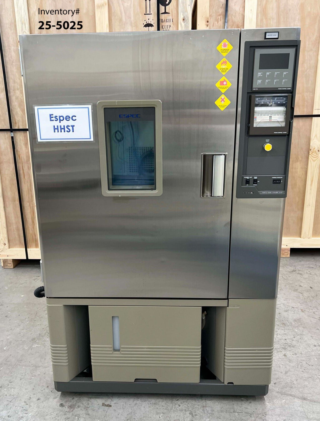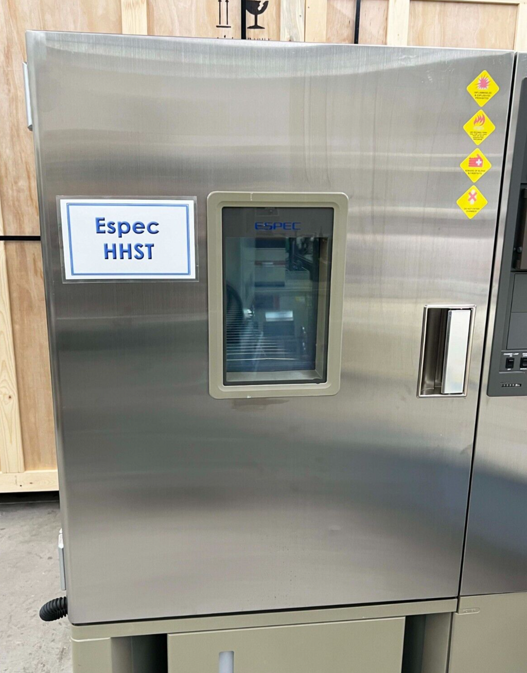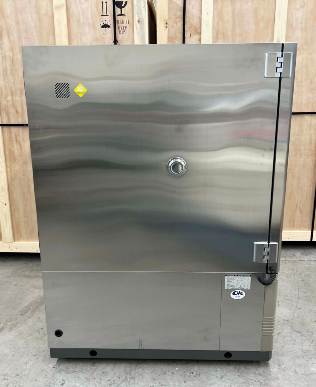 This Tabai Espec PH-3FT Temperature and Humidity Chamber, is used working surplus. The hinges on the plastic door covering the circuit breaker, located on the front bottom right of the unit have been broken. However, the door can still be used to cover the circuit breaker and connection terminals located in this area. Otherwise, the physical condition of the chamber is good and clean.