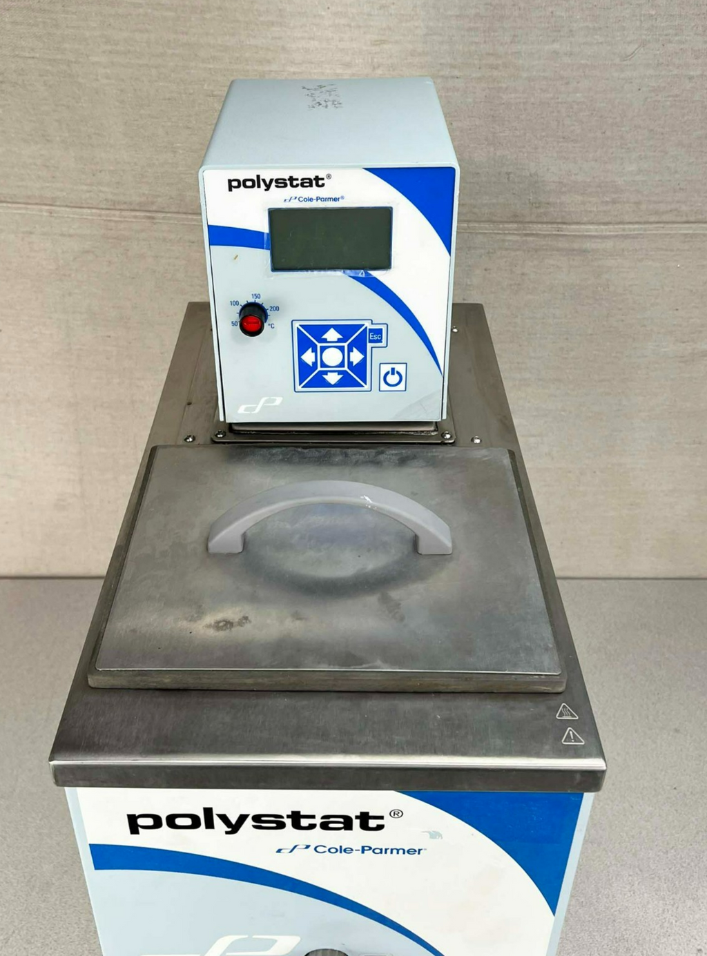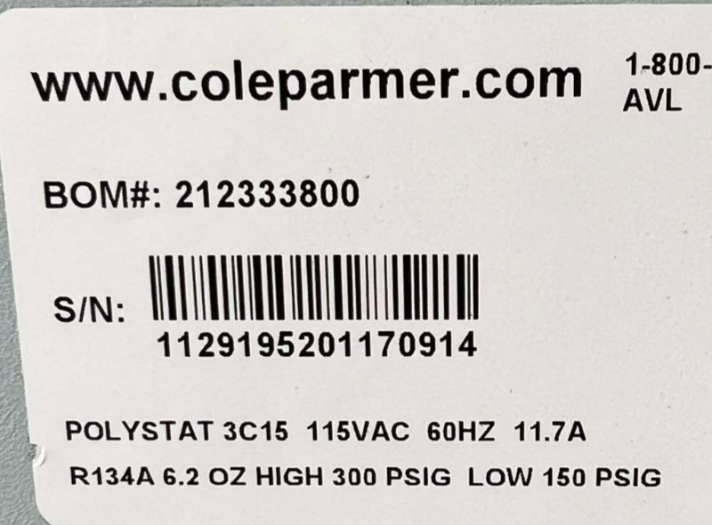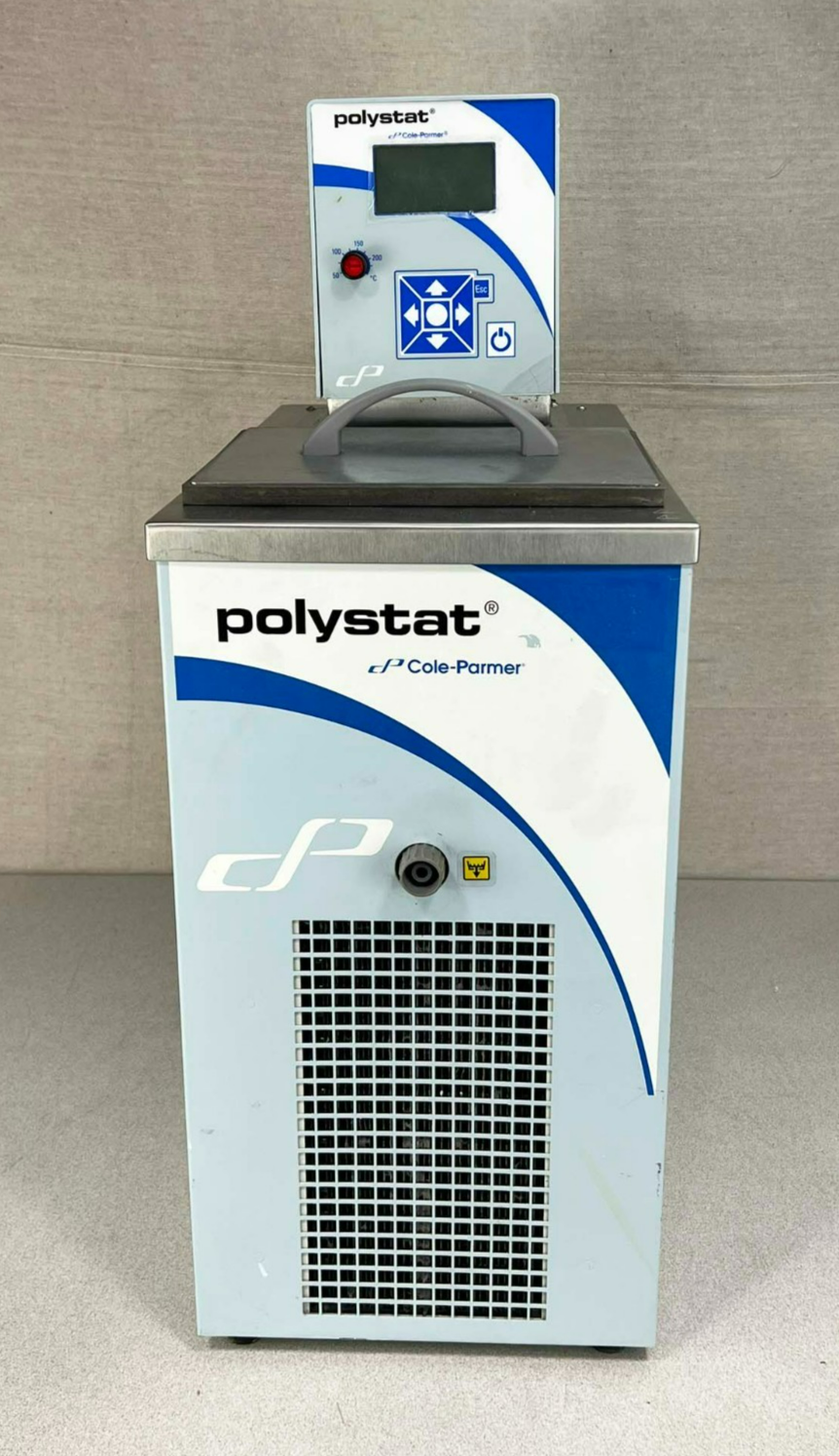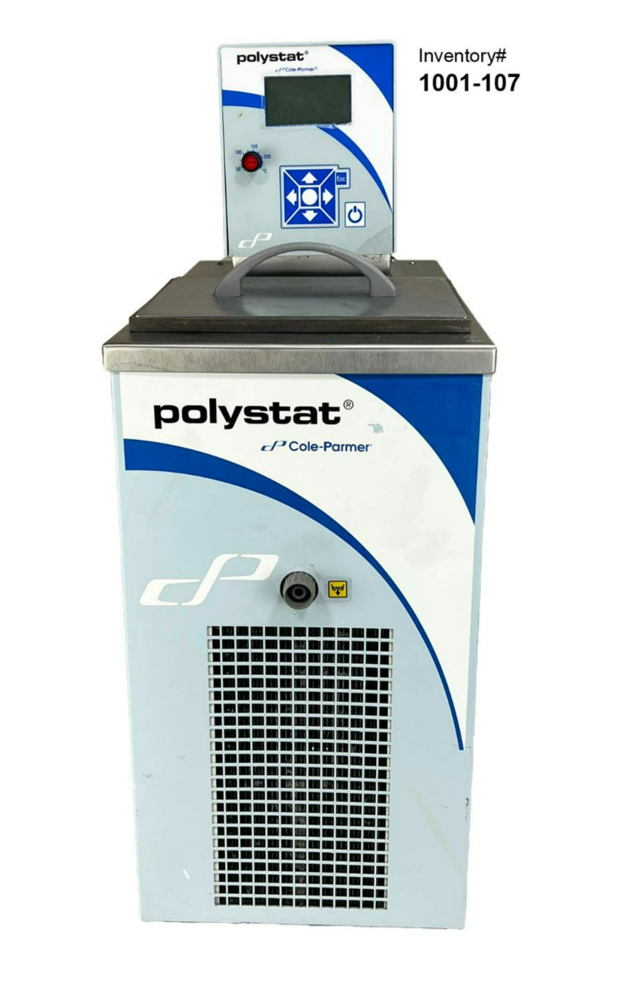 This Cole Parmer Polystat 3C15 212333800 Chiller, is used tested working surplus. It shows signs of use and handling, such as, minor scuffing and scratching. Also, the laminate on the bottom right corner on the face of the unit is peeled slightly (seen in pictures). Otherwise, the physical condition of the unit is good and clean.