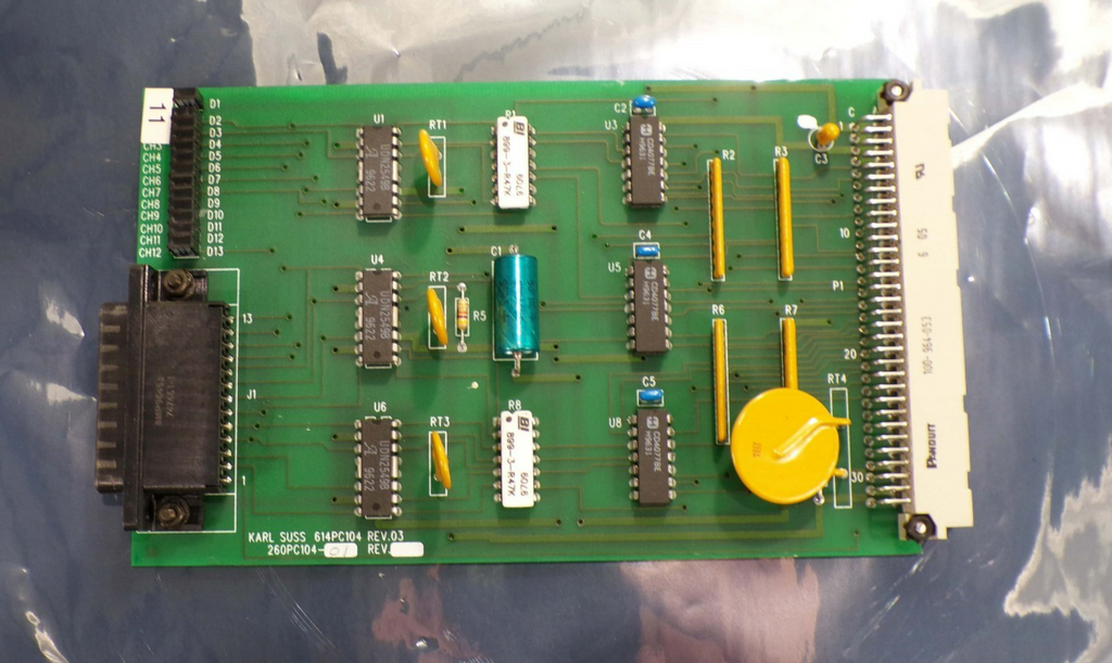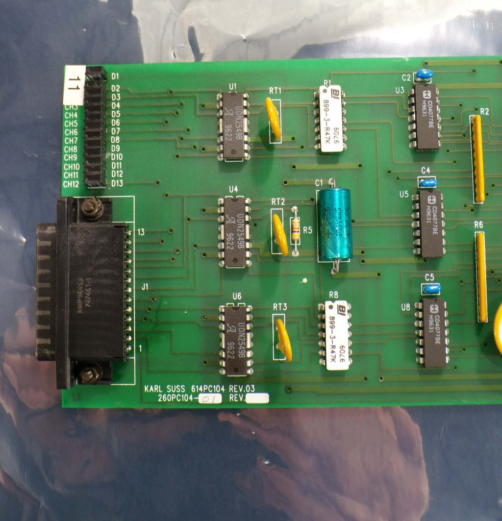 This Kark Suss 614PC104 (Rev 03) Circuit Board 260PC104-01, is used working surplus. The physical condition of the circuit board is good and clean. It was removed from a Karl Suss MA 150 mask aligner.