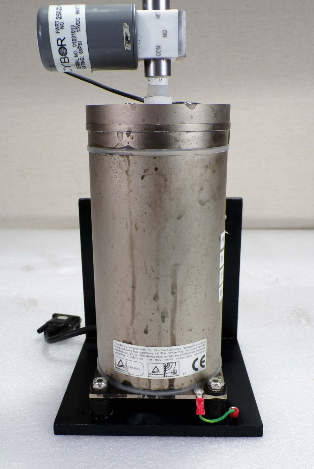 This Cybor 25823-18 05026-00CL B Photo Resist Pump, is used working surplus. However, there are three cut wire on the connector located closer to the top of the tank. Also, the unit shows signs of use and handling, such as, process reside on it. Otherwise, the physical condition of the unit is good and clean.