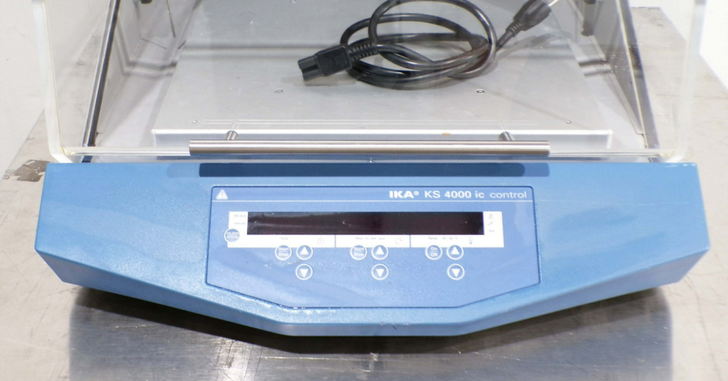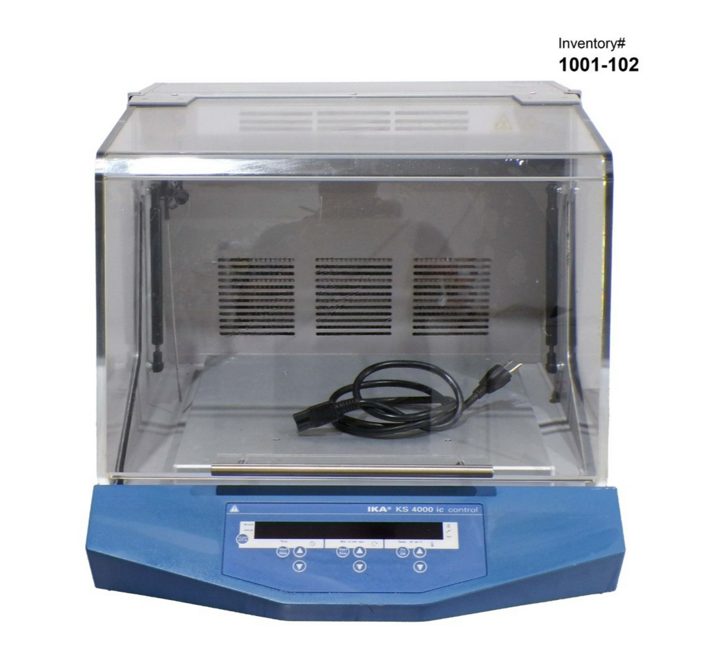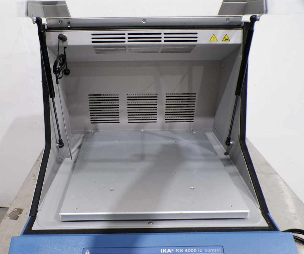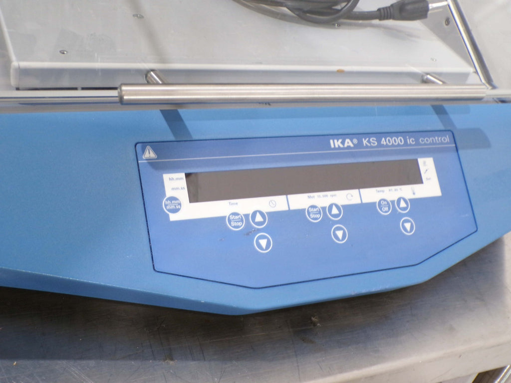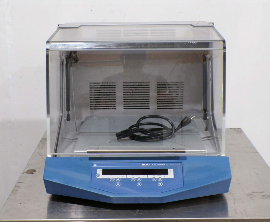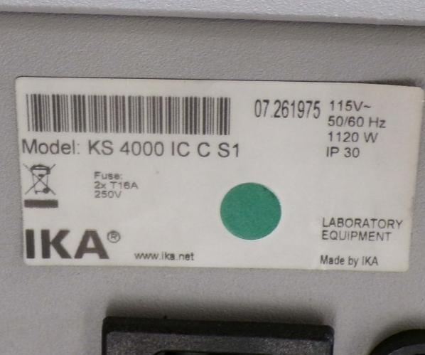 This IKA KS 4000 ic Control Incubator Shaker, is used tested working surplus. It shows signs of use and handling, such as, scratching on a panel. Also, there is a fracture mark in the glass, that does not leak. Otherwise, the physical condition of the unit is good and clean.
