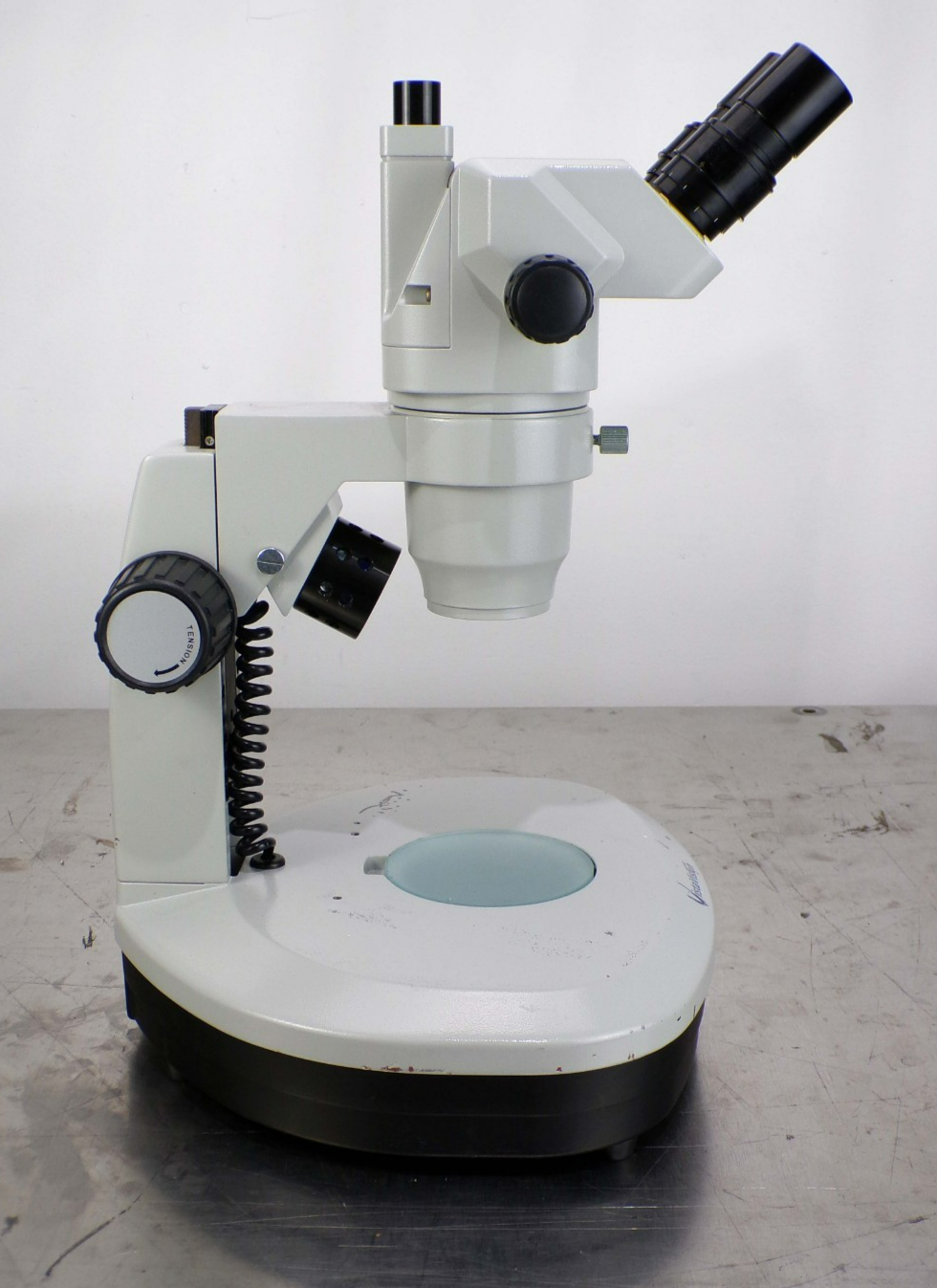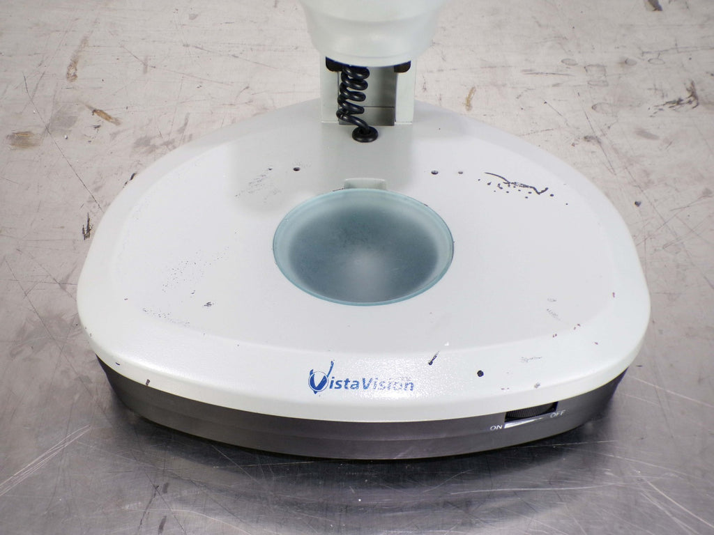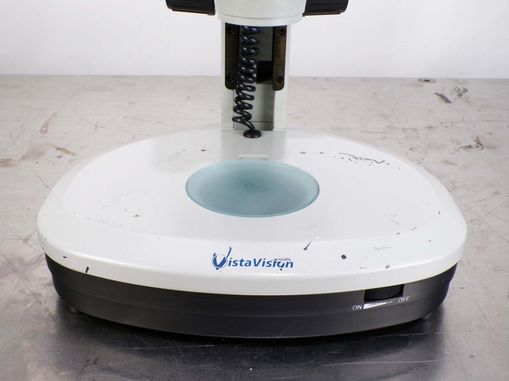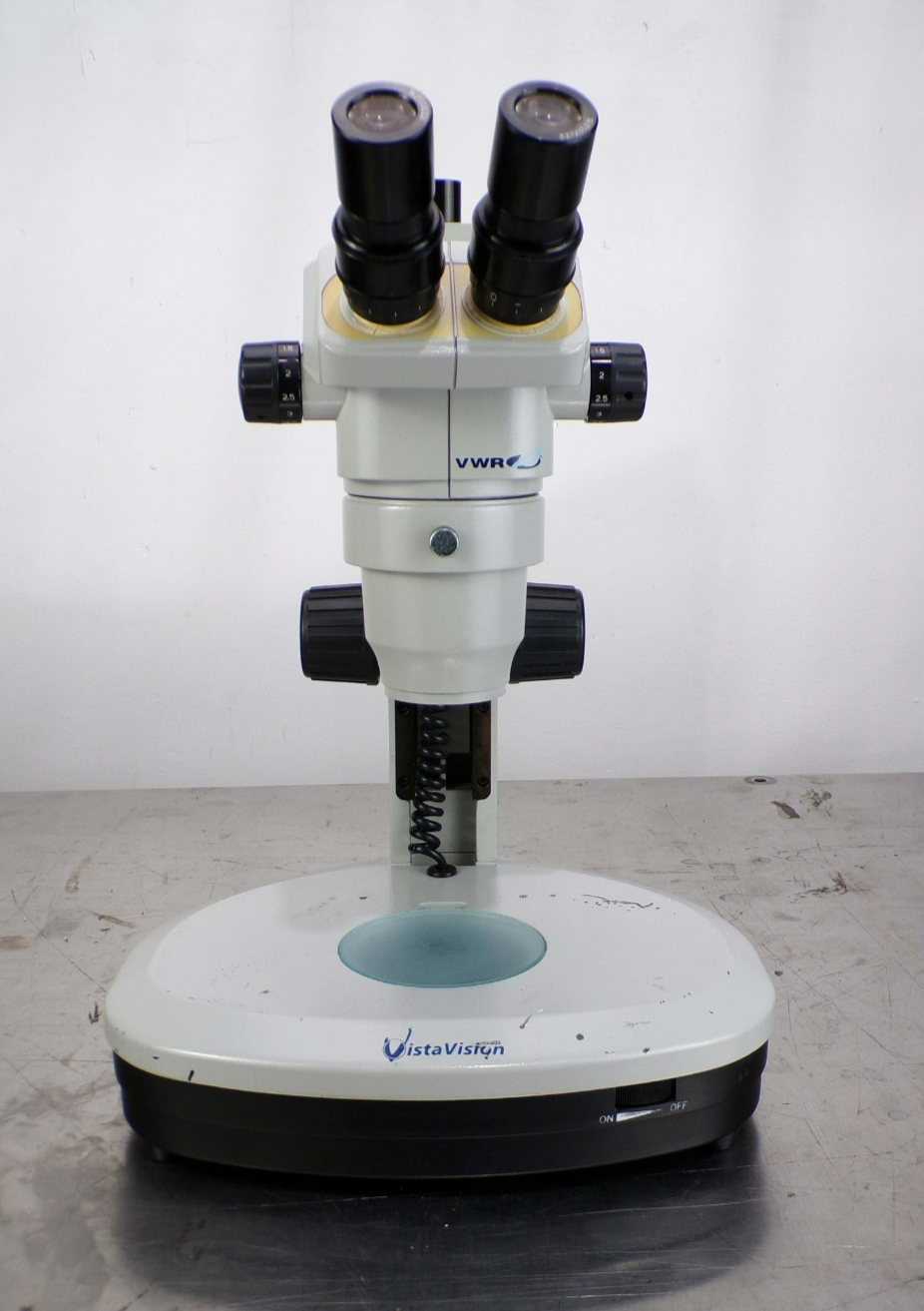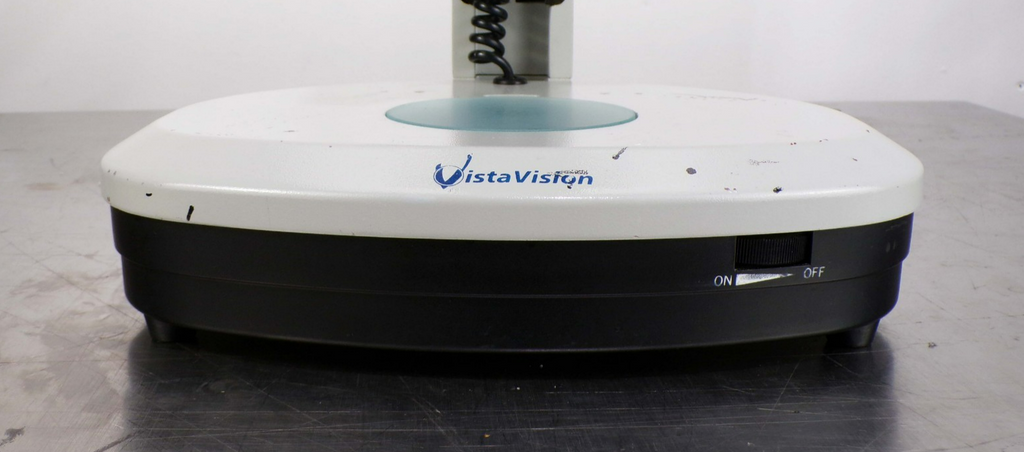 This VWR Vista Vision Stereozoom Microscope, is used working surplus. It shows signs of use and handling, such as, minor scuffing and marks (seen in pictures). Otherwise, the physical condition of the unit is good and clean.