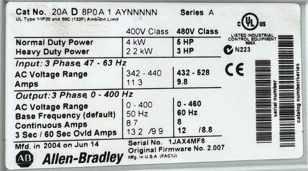This Allen Bradley PowerFlex 70 20A D8P0A1AYNNNNN Drive, is used working surplus. The physical condition of the unit is good and clean.