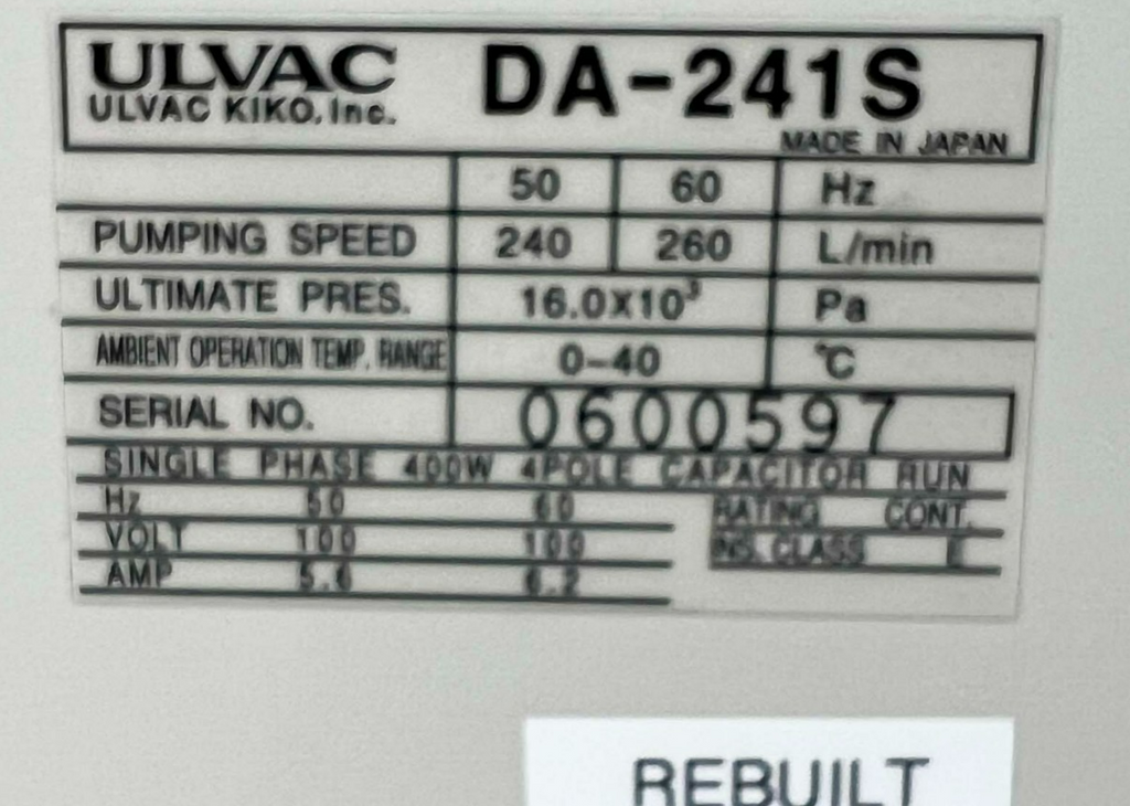 This Ulvac DA-241A Vacuum Pump, is used working surplus. The physical condition of the pump is good and clean.