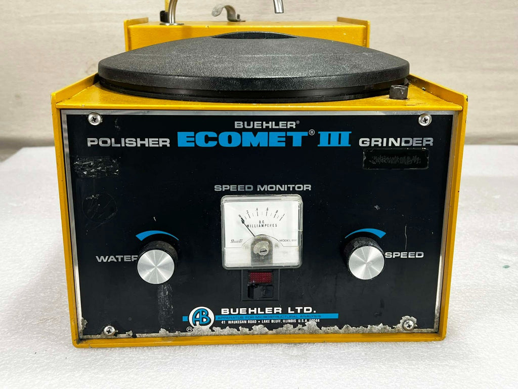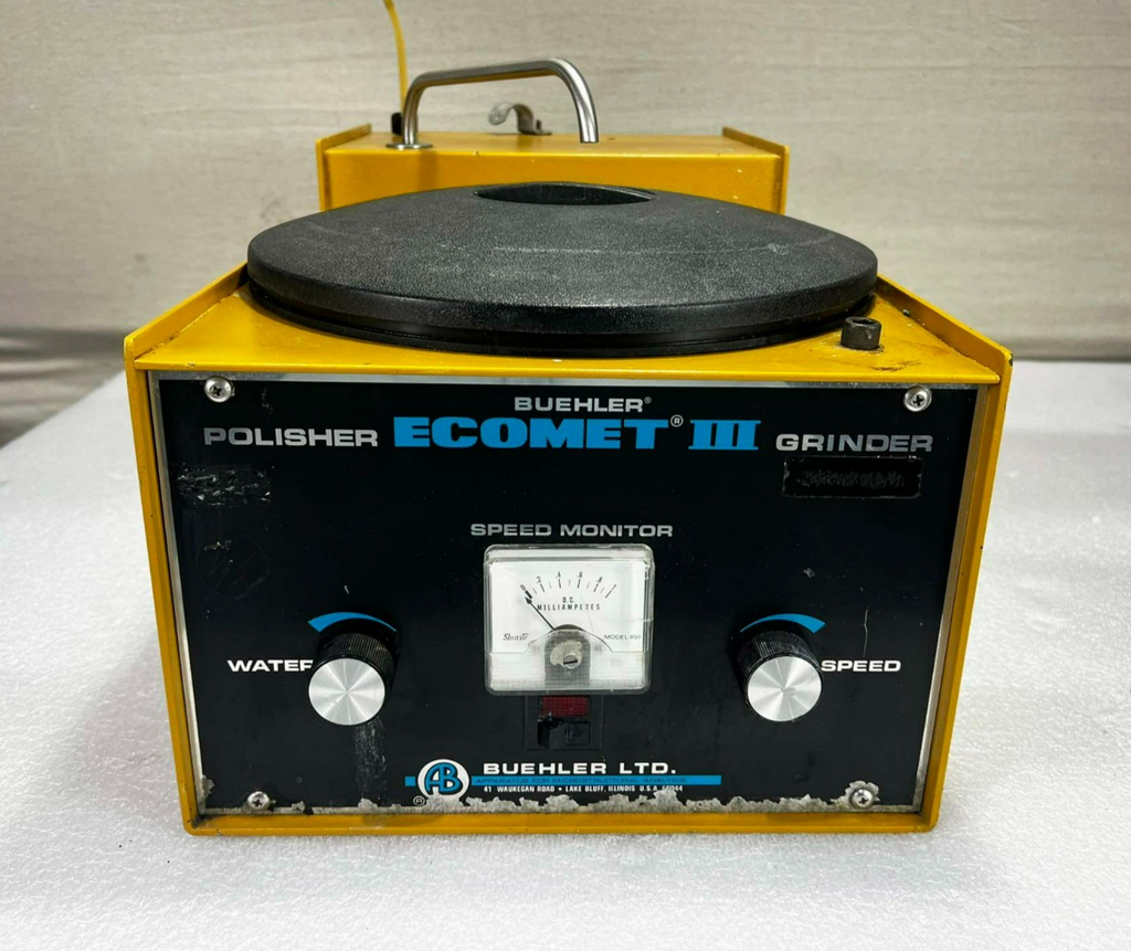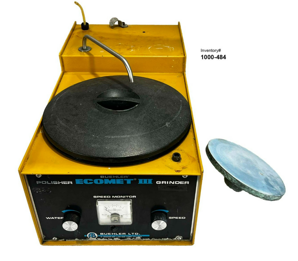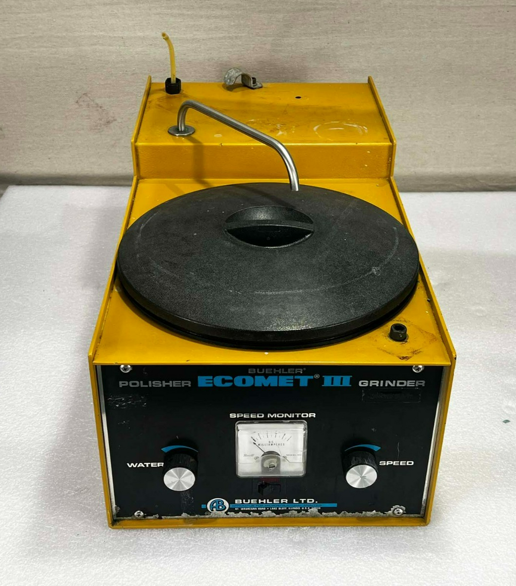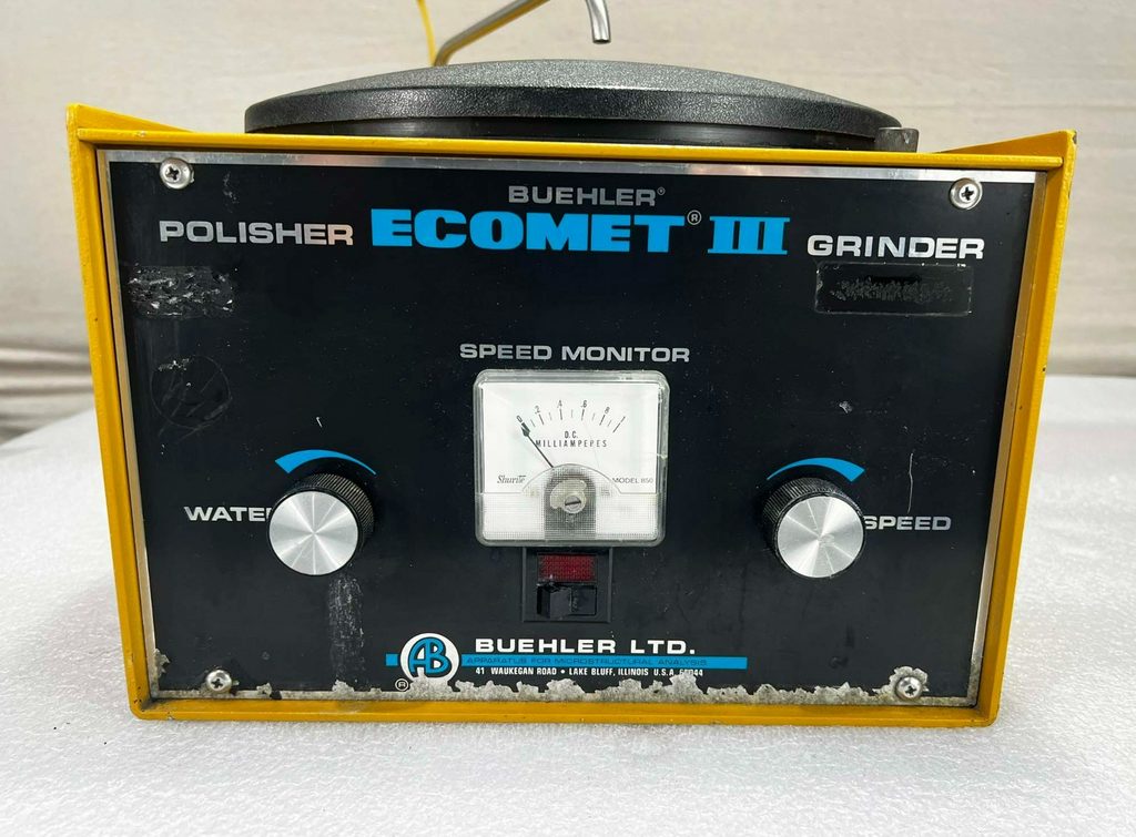 This Buehler Ecomet III Polisher Grinder, is used working surplus. However, the chucks included with the unit fit loosing on the motor shaft and will need be secured by some means. Also, the unit shows signs of use and handling, such as, scuffing and scratching. Further, the paint is flaking along the bottom edge on the from of the unti (seen in pictures). Otherwise, the physical condition of the unit is good and clean.