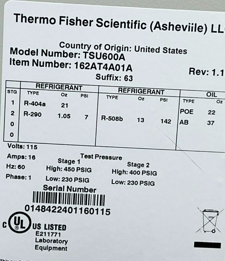 Thermo Fisher TSU600A Ultra Low Temperature Freezer *used working