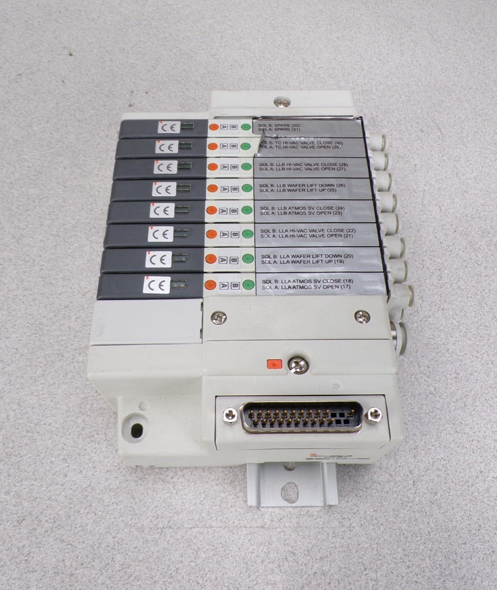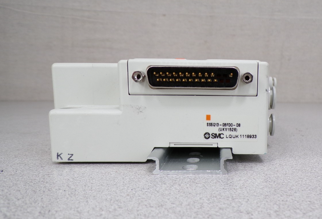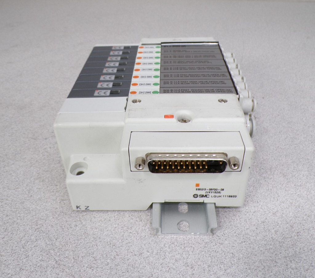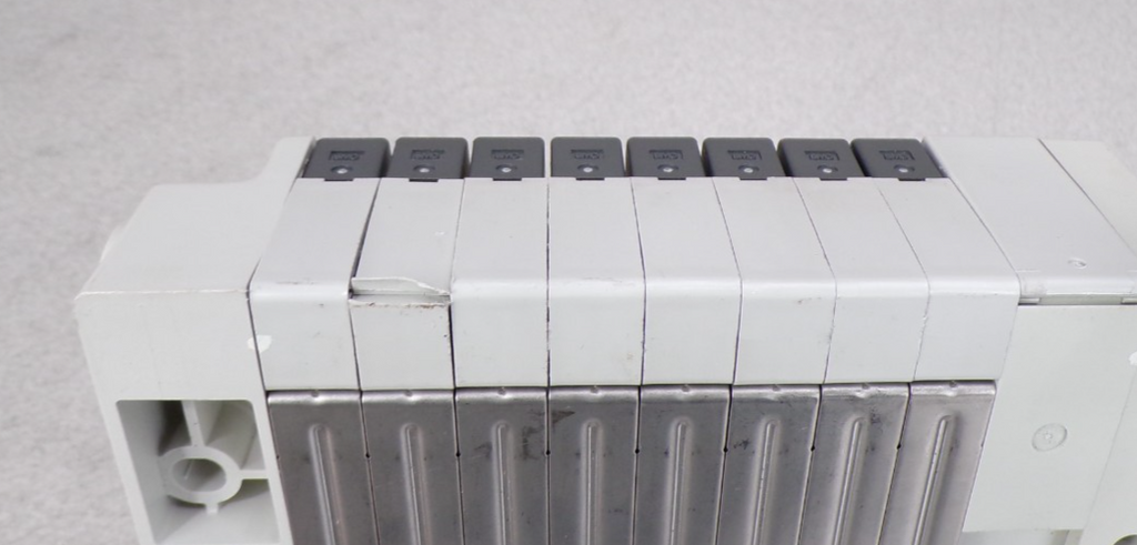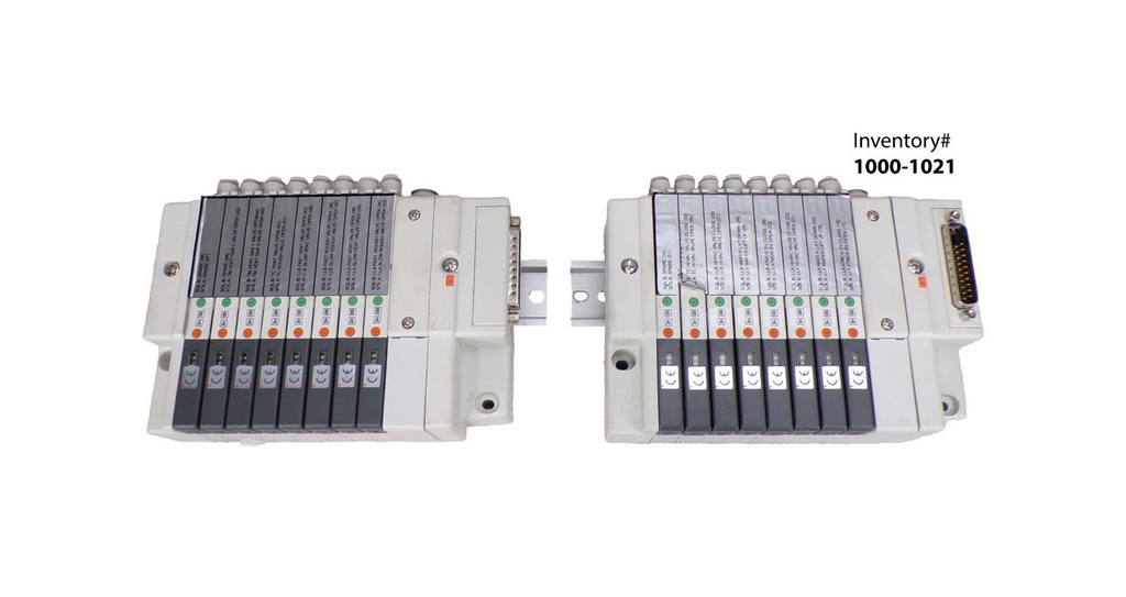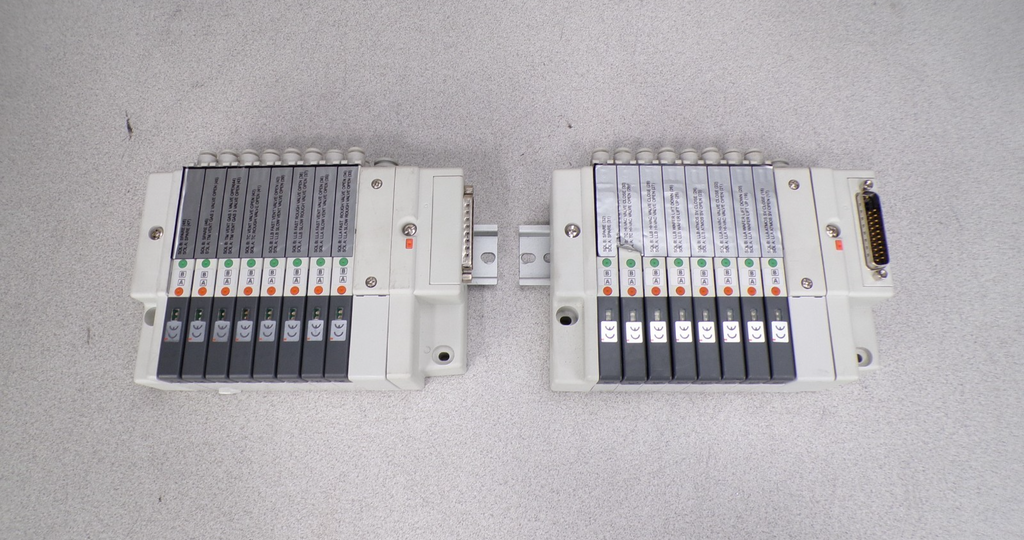 These SMC SS5Q13-08FDO-DB Pneumatic Manifold’s are used working surplus. They show signs of handling, such as minor scuffing and scratching. Otherwise, they are in good condition. The plastic covering has broken (pictured) on one of the edges of one of the units.